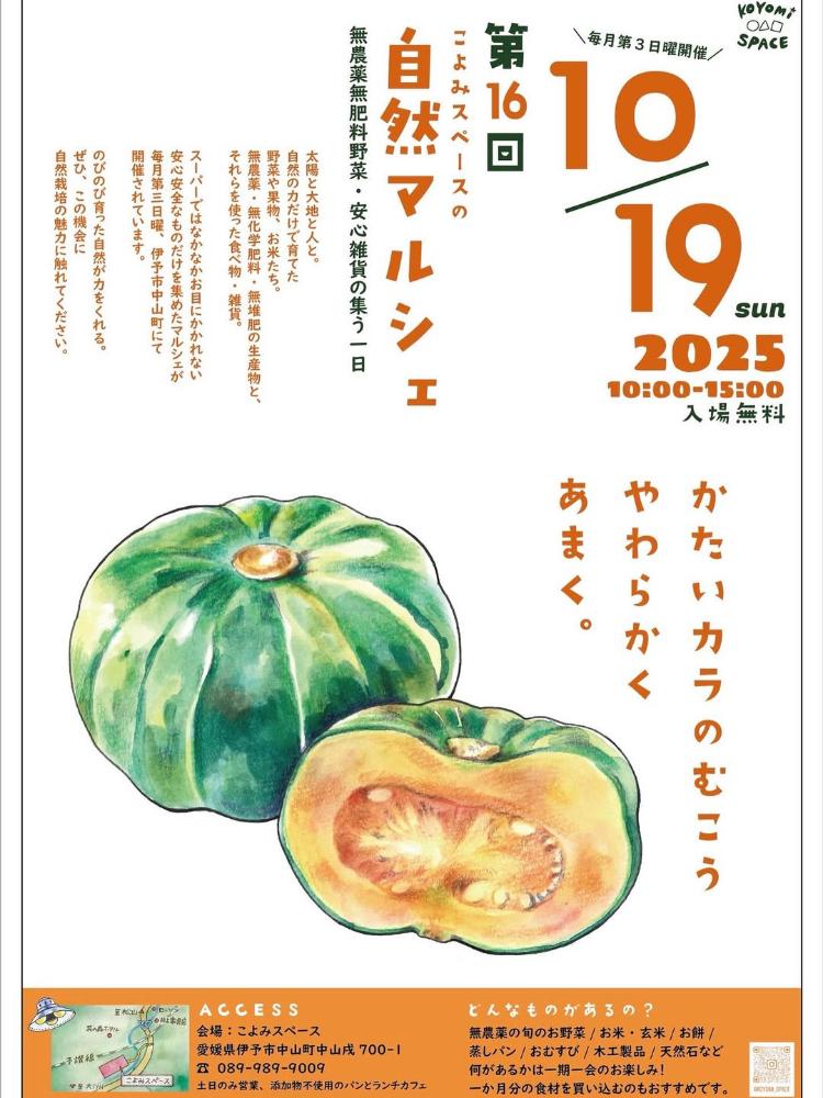 愛媛県伊予市中山町の「こよみスペース」で、2025年10月19日(日)に、「第16回 こよみスペースの自然マルシェ」が開催されます。開催概要、出店情報···